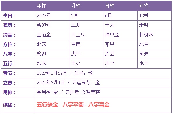 2023年7月6日13时出生的宝宝五行缺金
