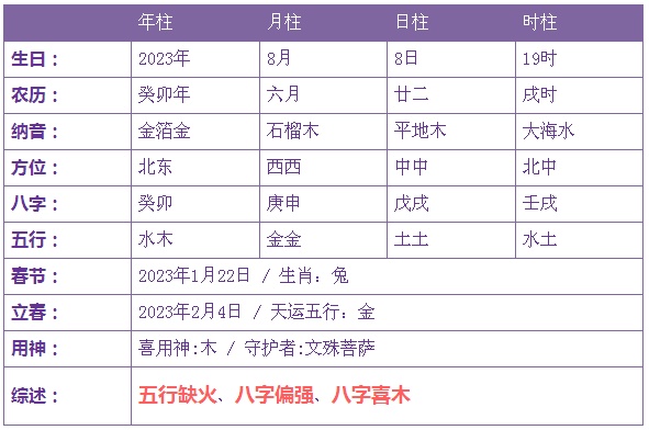 2023年8月8日3时出生的宝宝五行缺火