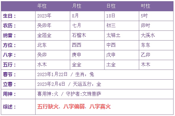 2023年8月18日3时出生的宝宝五行缺火