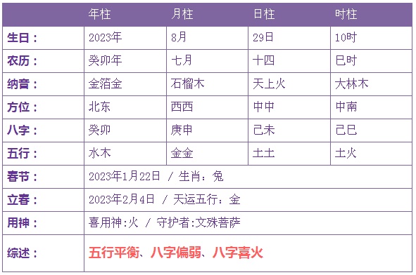 2023年8月29日10时出生的宝宝五行不缺