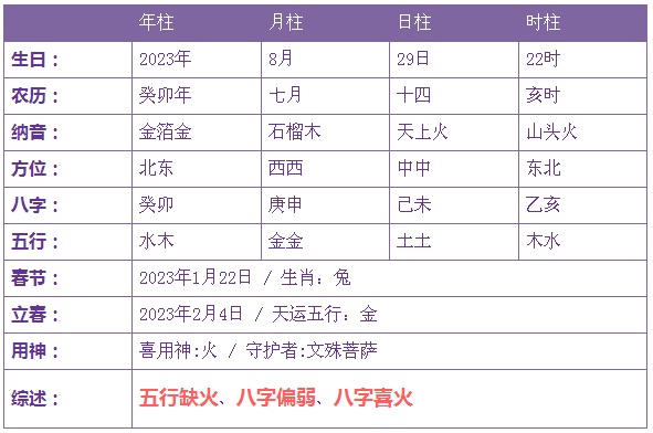 2023年8月29日1时出生的宝宝五行缺火