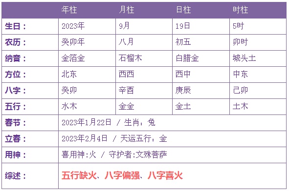 2023年9月19日5时出生的宝宝五行缺火