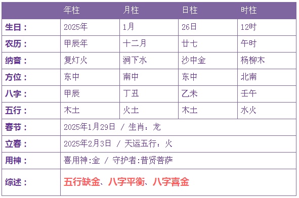 2025年1月26日12时出生的宝宝五行缺金