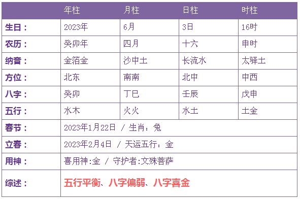 2023年6月3日5时出生的宝宝五行缺金