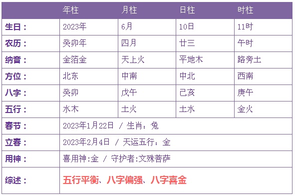2023年6月10日3时出生的宝宝五行缺金