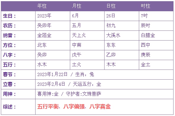 2023年6月26日5时出生的宝宝五行缺金