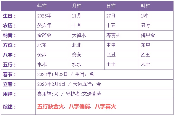 2023年11月27日1时出生的宝宝五行缺火金