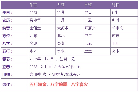 2023年11月27日6时出生的宝宝五行缺金