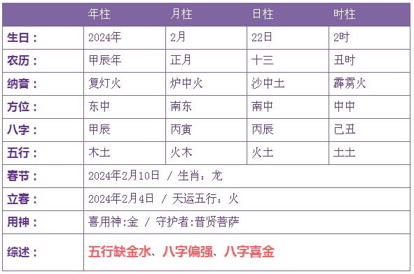2024年2月22日1时出生的宝宝五行缺金水