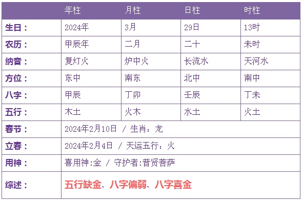 2024年3月29日13时出生的宝宝五行缺金