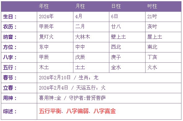 2024年4月6日1时出生的宝宝五行不缺