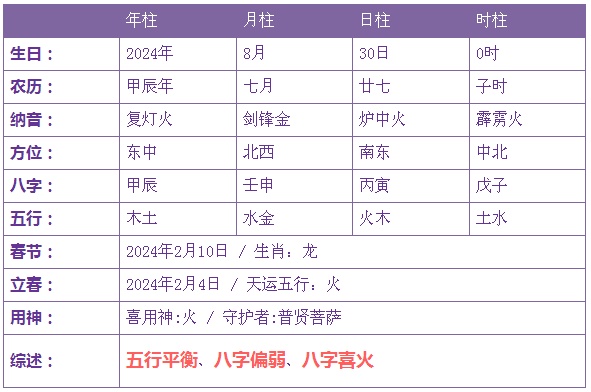 2024年8月30日12时出生的宝宝五行不缺