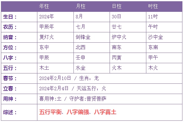 2024年8月30日8时出生的宝宝五行不缺
