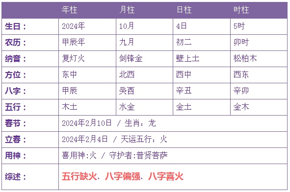 2024年10月4日5时出生的宝宝五行缺火
