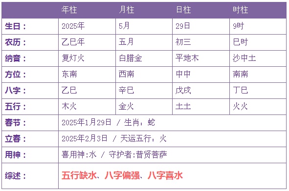 2025年5月29日1时出生的宝宝五行不缺