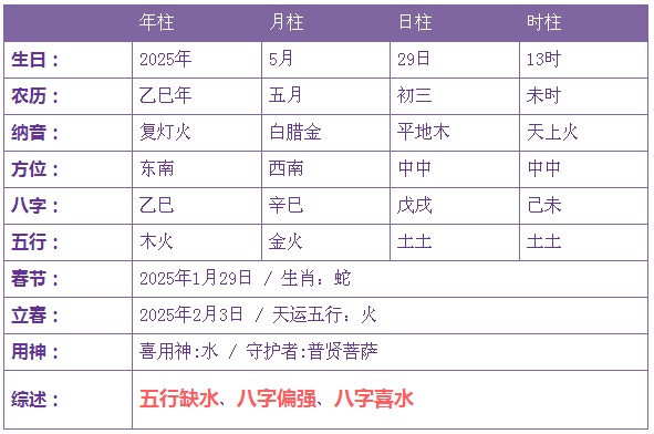 2025年5月29日13时出生的宝宝五行缺水