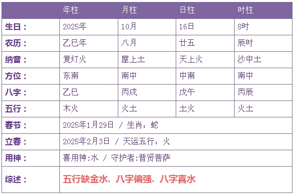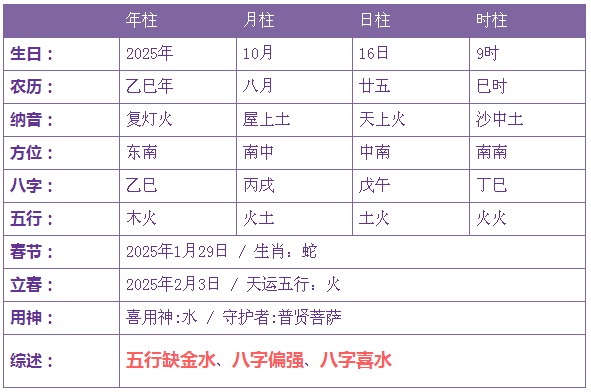 2025年10月16日15时出生的宝宝五行缺水