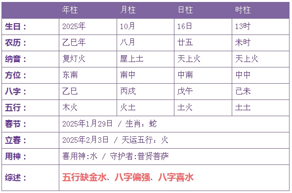 2025年10月16日13时出生的宝宝五行缺金水
