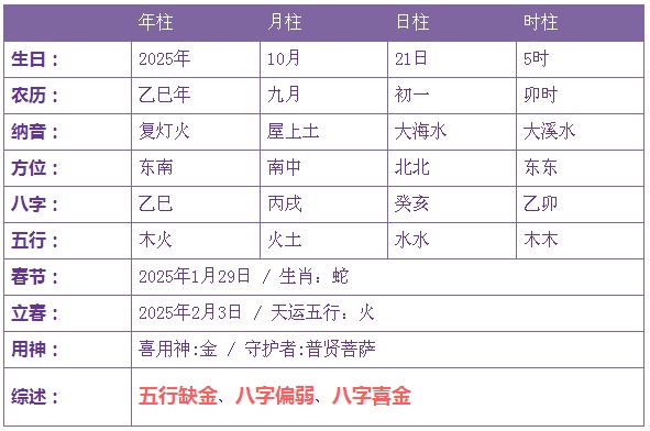 2025年10月21日5时出生的宝宝五行缺金