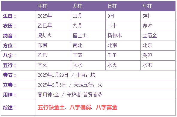 2025年11月9日5时出生的宝宝五行缺土金