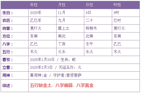 2025年11月9日9时出生的宝宝五行缺土金