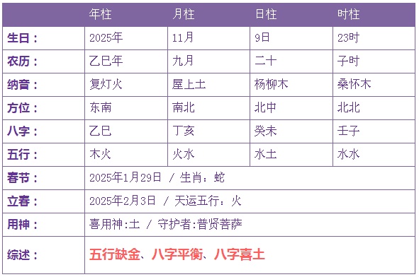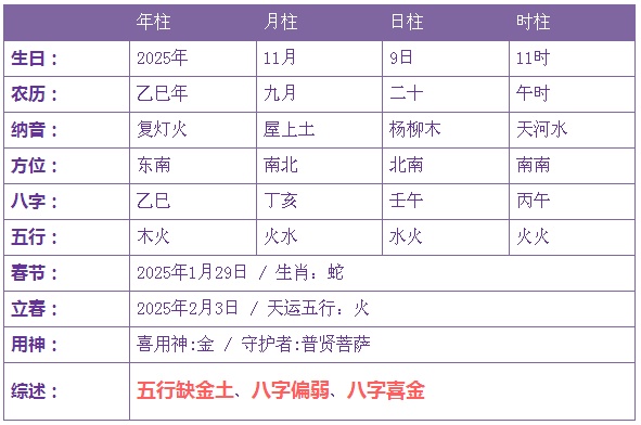 2025年11月9日3时出生的宝宝五行缺土金