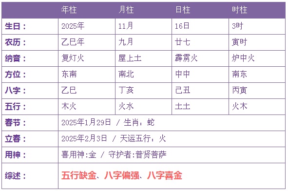2025年11月16日3时出生的宝宝五行缺金