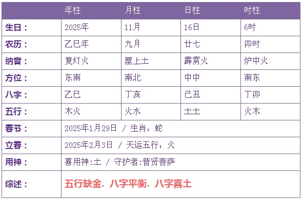 2025年11月16日6时出生的宝宝五行缺金