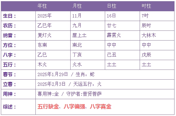 2025年11月16日7时出生的宝宝五行缺金