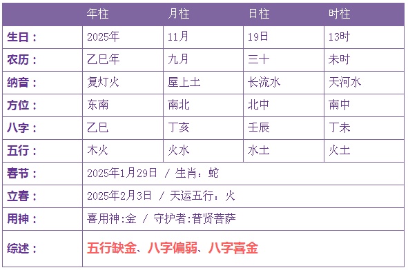 2025年11月19日13时出生的宝宝五行缺金