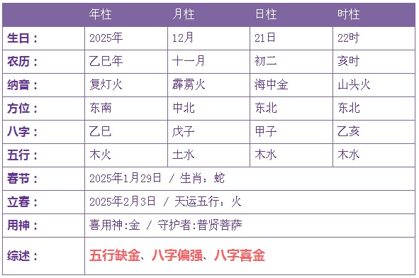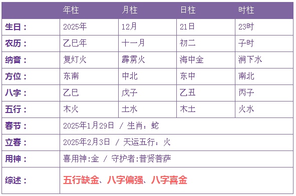 2025年12月21日2时出生的宝宝五行缺金