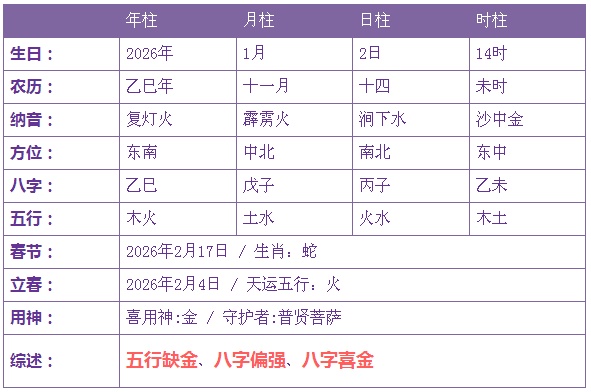 2026年1月2日生辰八字分析:公历生日:2026年 1月 2日 星期五 摩羯座 (阳历)