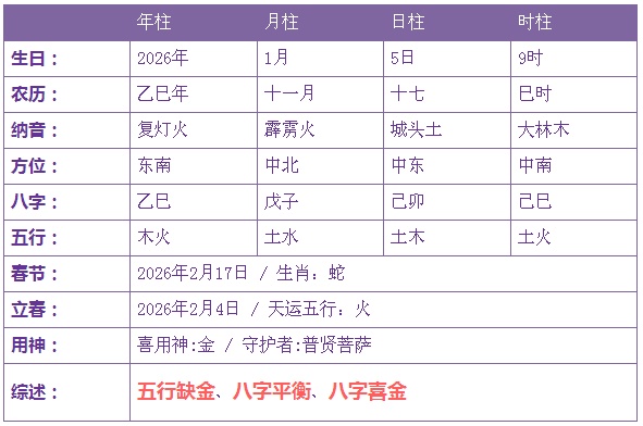 2026年1月5日生辰八字分析:公历生日:2026年 1月 5日 星期一 摩羯座 (阳历)