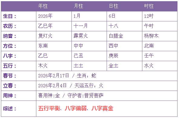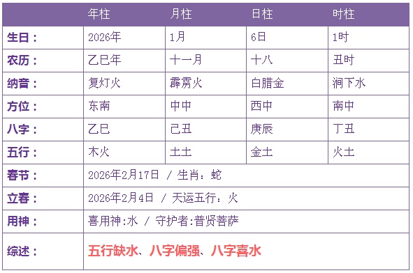 2026年1月6日生辰八字分析:公历生日:2026年 1月 6日 星期二 摩羯座 (阳历)