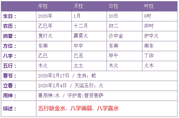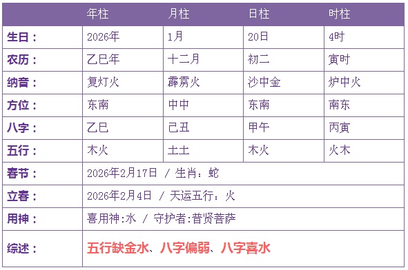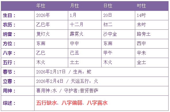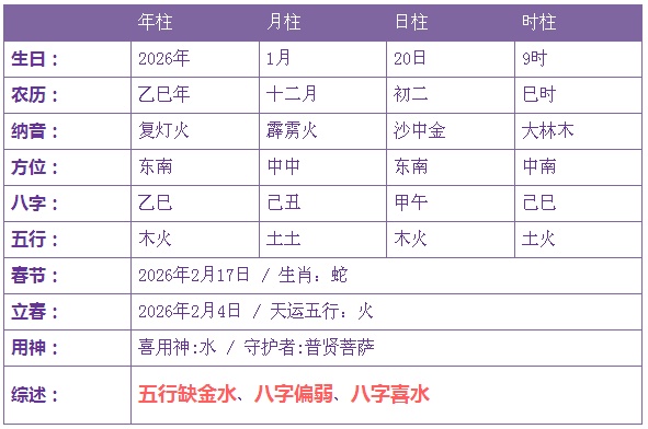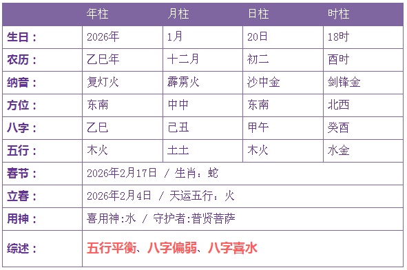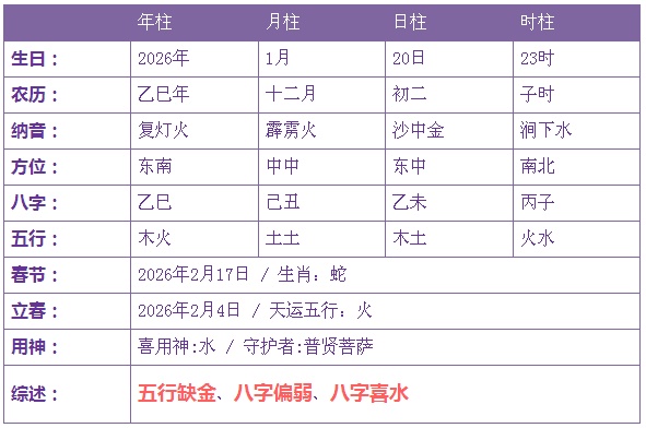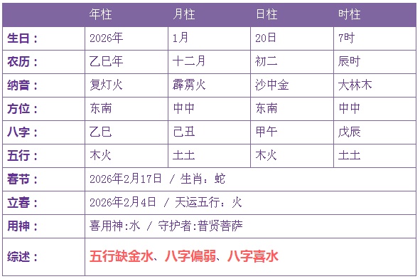 2026年1月20日生辰八字分析:公历生日:2026年 1月 20日 星期二 水瓶座 (阳历)