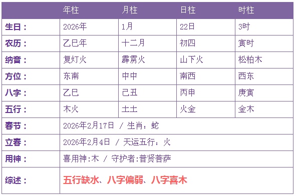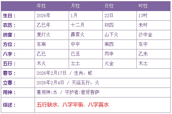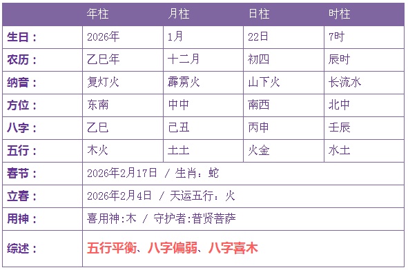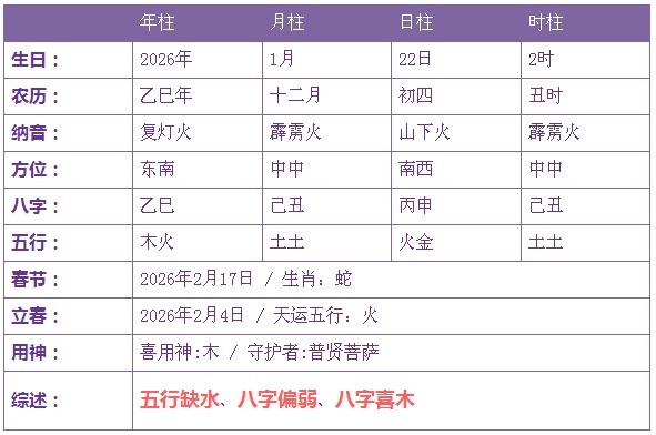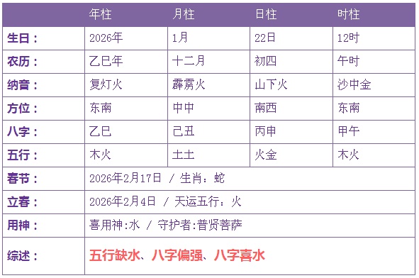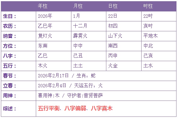 2026年1月22日生辰八字分析:公历生日:2026年 1月 22日 星期四 水瓶座 (阳历)